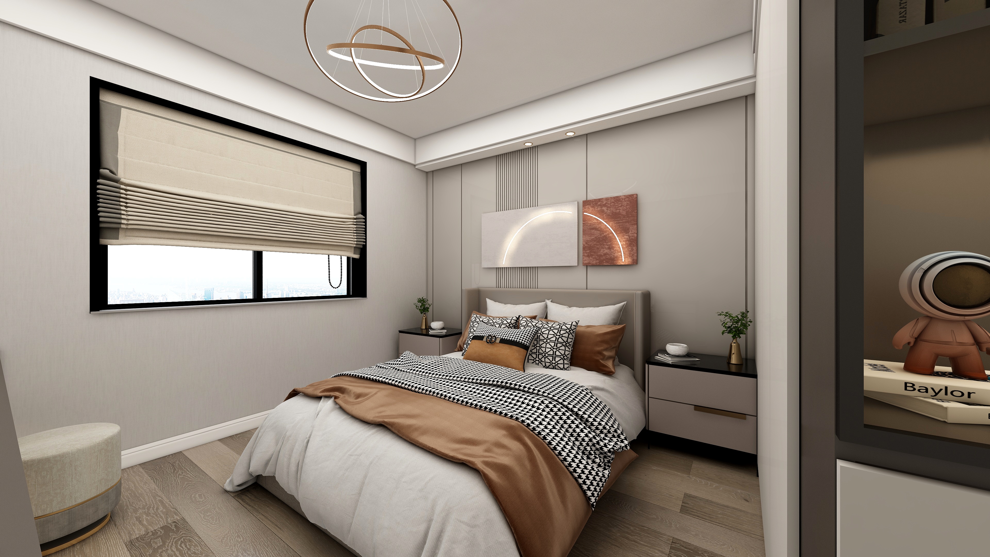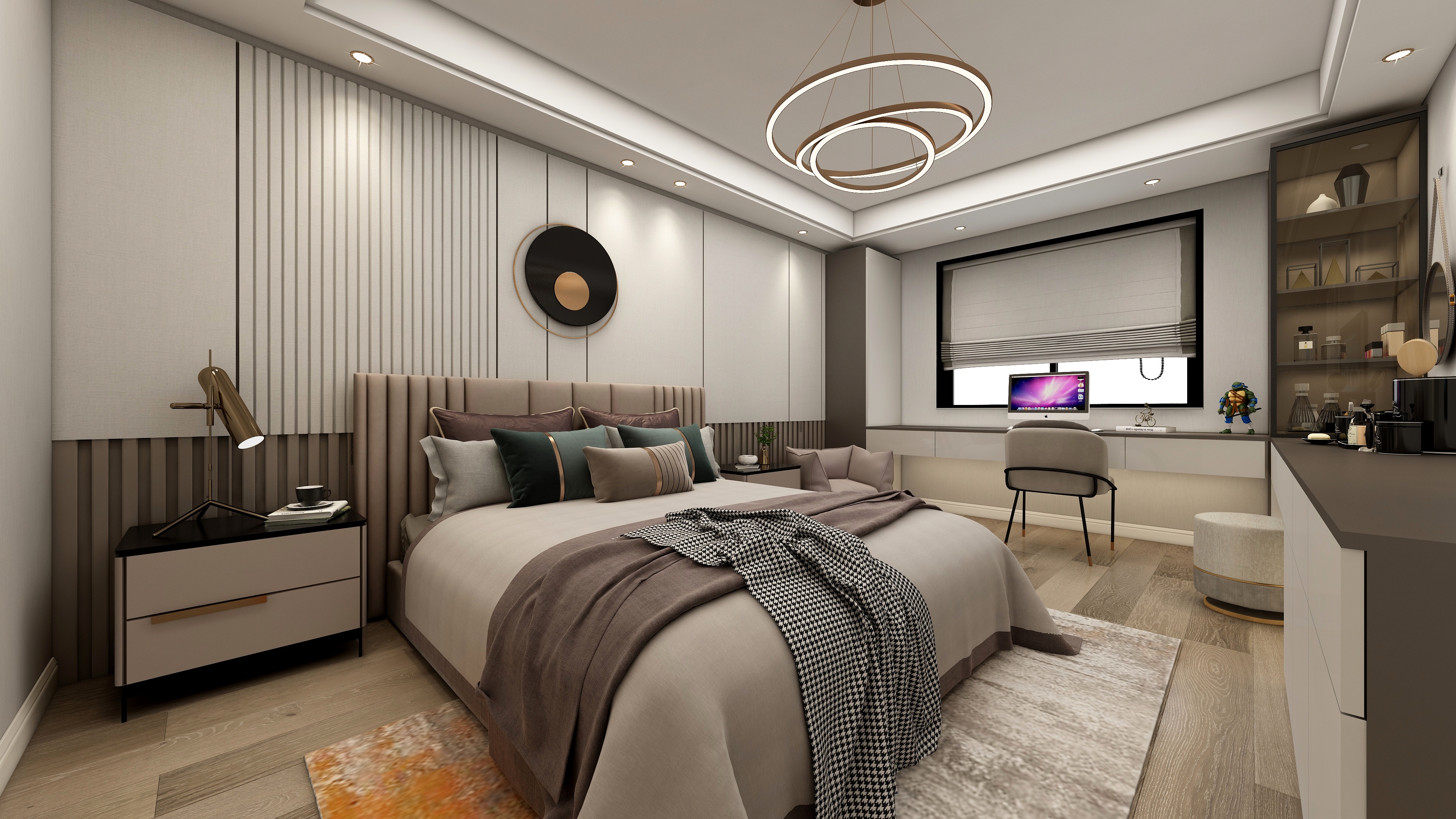 主卧以双色木质板做地面设计,增加室内的温馨感与舒适感,双眼皮吊顶搭配环形灯饰,美观又明亮。主墙面以浅灰色护板墙做设计,增加室内的质感,让空间更具有格调感。灰棕色床体对面做收纳柜,沿着窗台一侧增加悬空台面,拼凑成一个简单的书桌,满足业主使用。