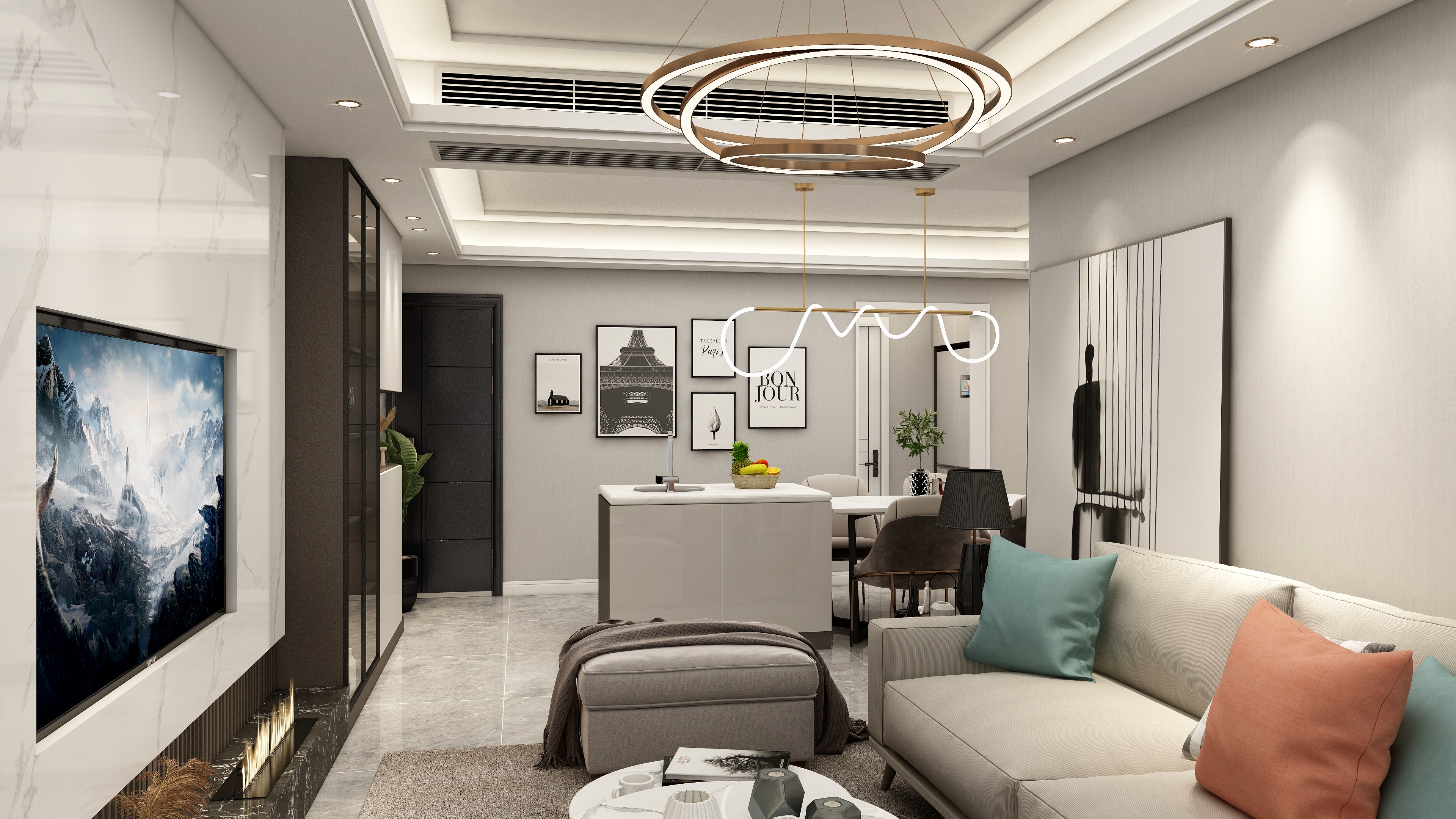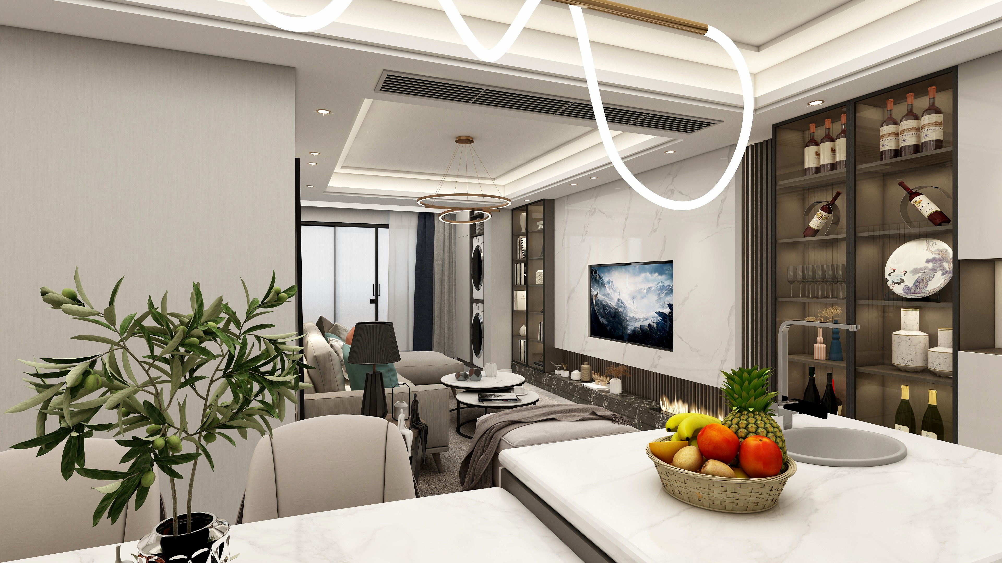 客厅电视机做白色底色的花纹大理石设计,增加时尚感,电视机内嵌于大理石中,节省空间又美观十足。电视机墙面做延伸到餐厅一侧,增加酒柜,以墨色玻璃做设计,增加整体的收纳空间。
